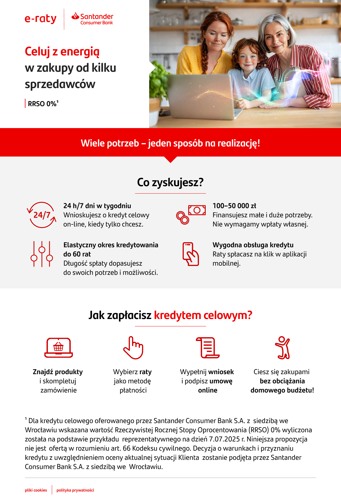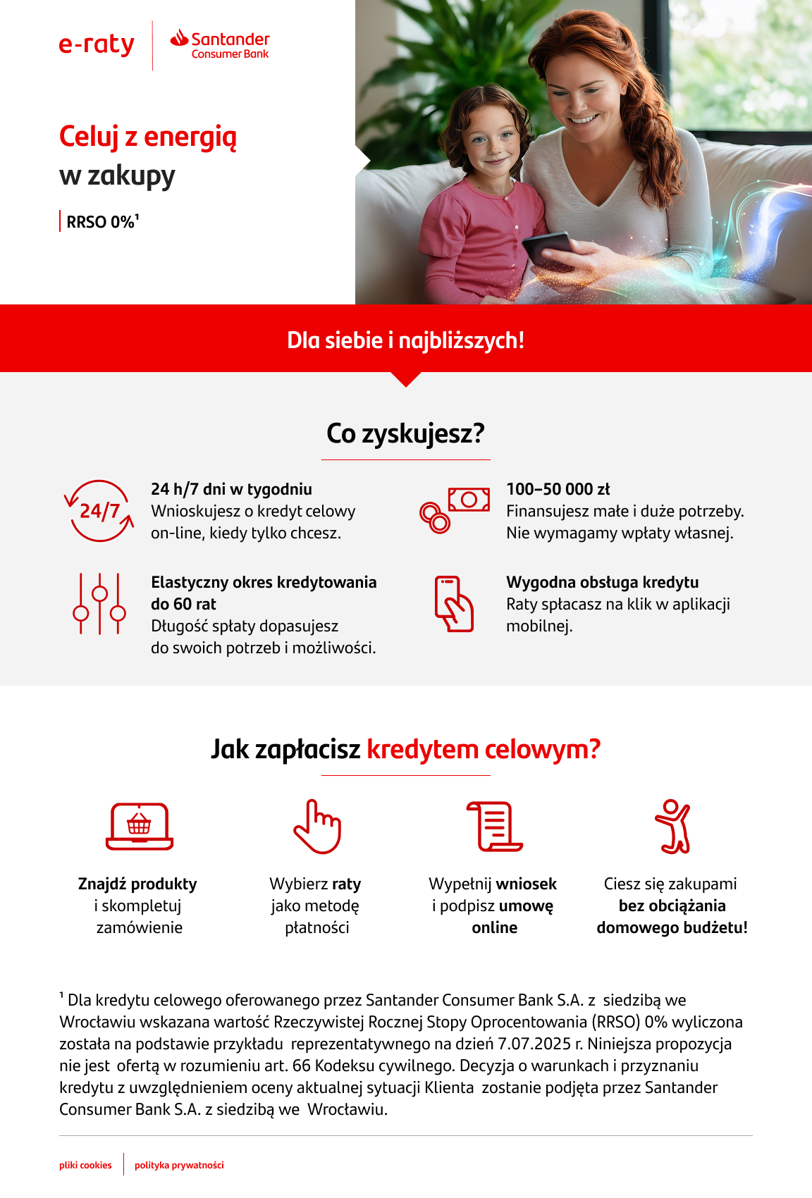 [Nazwa prawna Partnera Handlowego] występujący w roli pośrednika kredytowego, informuje swoich Klientów o możliwości skorzystania z kredytu celowego oferowanego przez Santander Consumer Bank S.A i udostępnia swoim klientom możliwość wnioskowania o kredyt celowy Santander Consumer Bank S.A.
