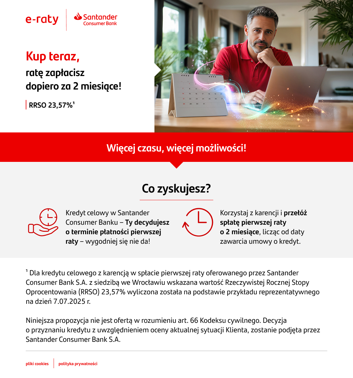 Niniejsza propozycja nie jest ofertą w rozumieniu art. 66 Kodeksu Cywilnego. Decyzja o przyznaniu i warunkach kredytu z uwzględnieniem oceny aktualnej sytuacji Klienta zostanie podjęta przez Bank. Szczegóły na www.santanderconsumer.pl
